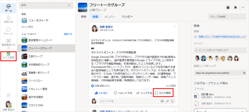 『サテライトオフィス・タスク管理機能 for Workplace from Meta』は、Workplace from Meta SNSタイムライン上でできるタスク管理、TODO管理機能です!SNSのタイムラインでは、各種情報に依頼事項も含まれると思いますが、SNS投稿文書内の文字を元に、タスク管理&進捗管理が可能です。現在は、パソコンのブラウザ版SNS画面で利用が可能です。管理されたタスク/TODOは、メールやチャットボットなどでも進捗通知が可能です。