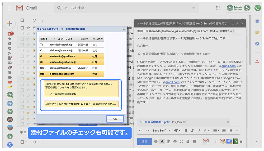 『サテライトオフィス・メール/SNS誤送信防止機能 for Google Workspace』 は、Google Workspaceでメール送信する際に、管理者ポリシーの上、メール内容をチェックし、送信前にチェックする機能です。(例:社外メールの場合は、警告を出す!メールToに数十件あった場合は、警告を出す!メール本文の文字をチェックし、メール送信をさせない!など)クライアント側のブラウザでチェックします。