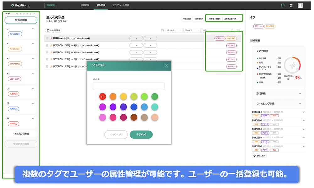部署や役職はもちろん、訓練結果状況に応じたタグ付けも簡単かつ柔軟に可能です。