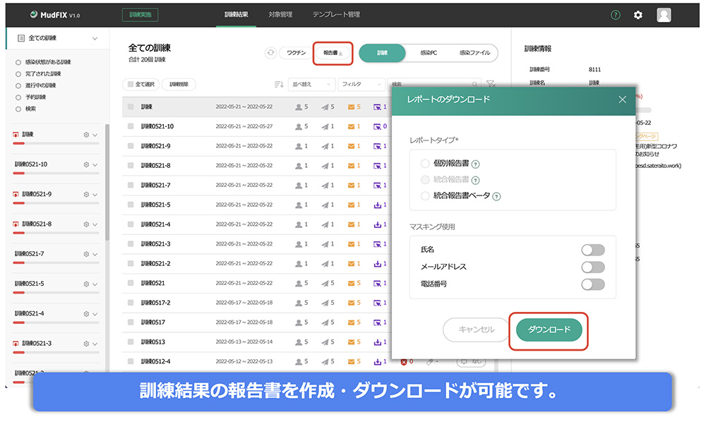 期間設定では、日付と時間が指定可能です。訓練状況は、リアルタイムに把握することが可能です。