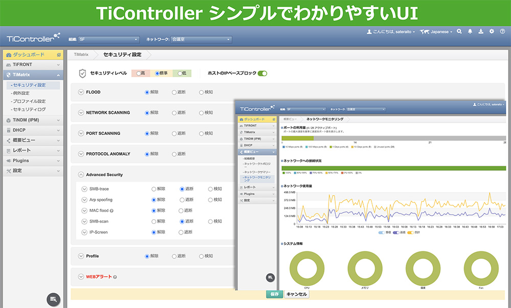 TiControllerはクラウドセキュリティスイッチを中央で管理するためのクラウド基盤管理システムです。