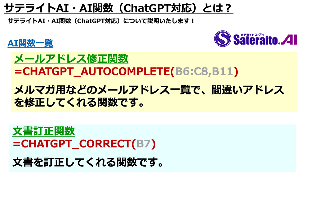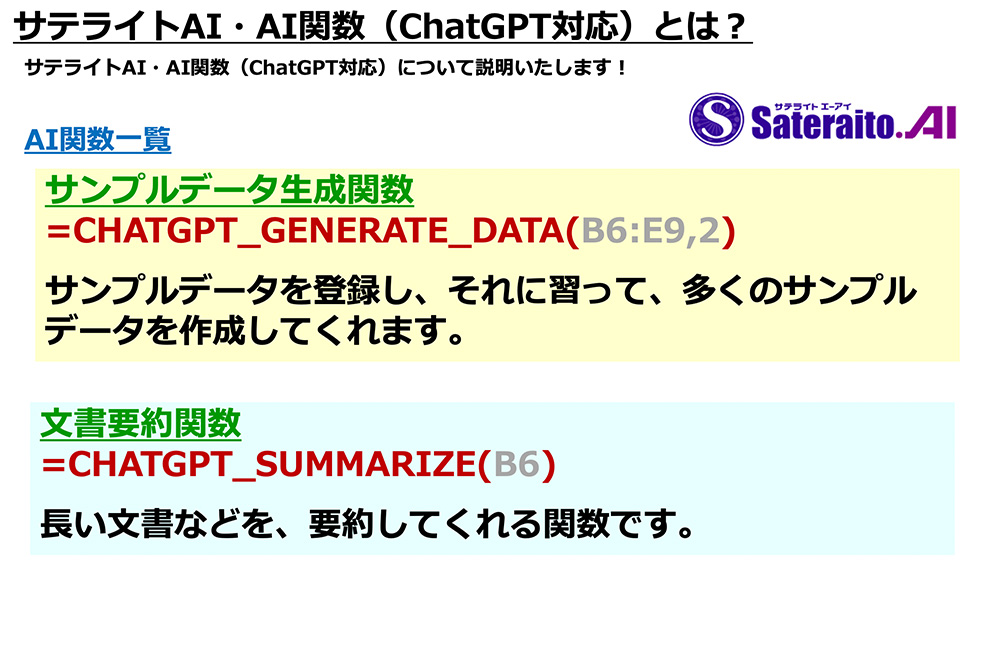 例:=ChatGPT("A1")な関数で、AI回答データを引っ張ってくる事が可能です。通常のAI質問の他、プロンプトを考慮した質問も可能です。→500文字程度に要約してください。ブログの文書を作成してください。メルマガ文書を作成してください。文書の中から問題点を洗い出してください。テストデータ用のサンプルデータを作成してくだい。文書を翻訳してください。などテンプレートは提供しております。また、カスタマイズで会社独自のプロンプトを適用したAI関数の開発も可能です。また、お客様の声などの文字分析は、サテライトAIの「分析AI」の方で展開中です。